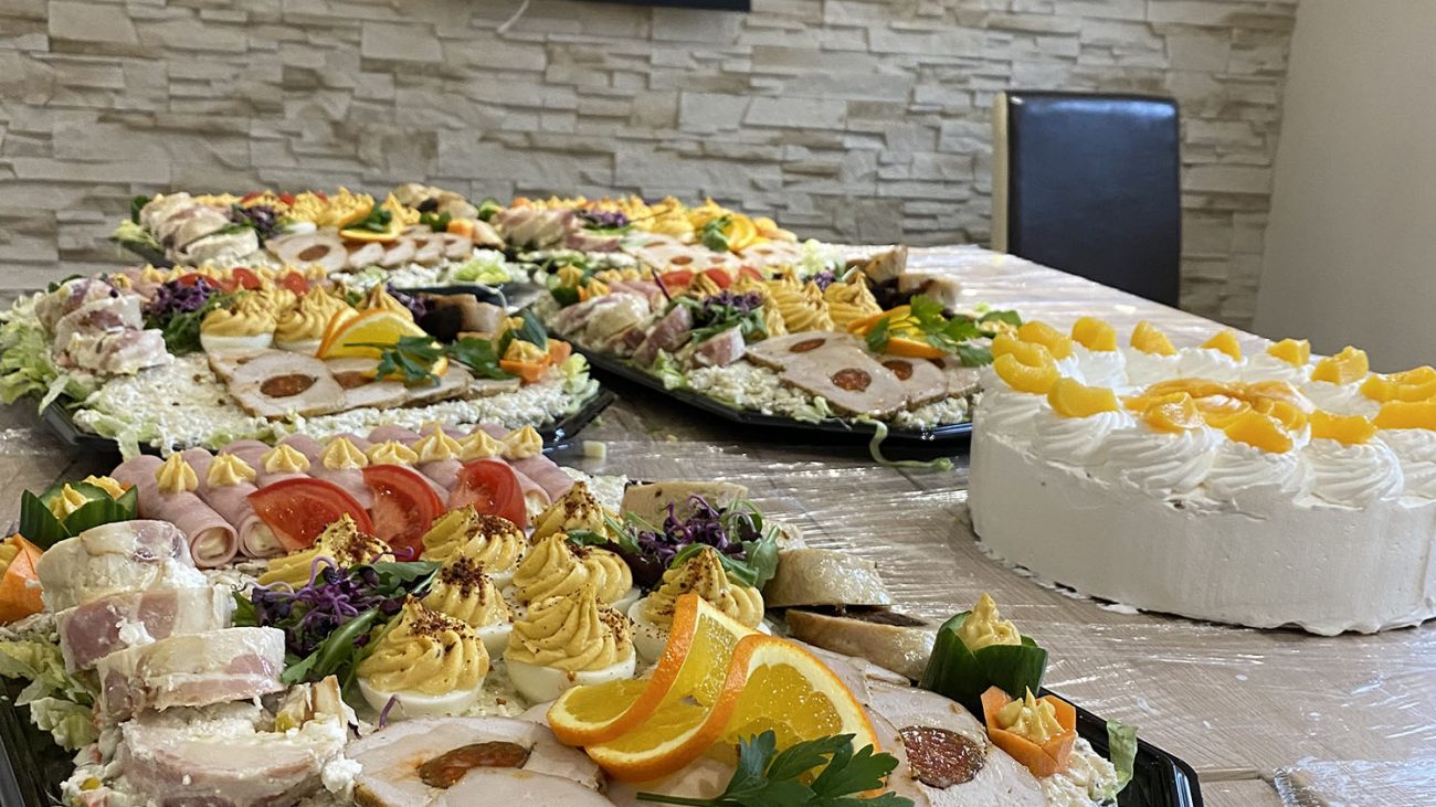 - Sült kacsacomb - Pácolt sertéskaraj rántva - Gesztenyés pulykarolád - Rántott fogas filé - Párolt jázminrizs - Hagymás-tört burgonya - Párolt káposzta - Waldorf saláta - Házi birsalma lekvár